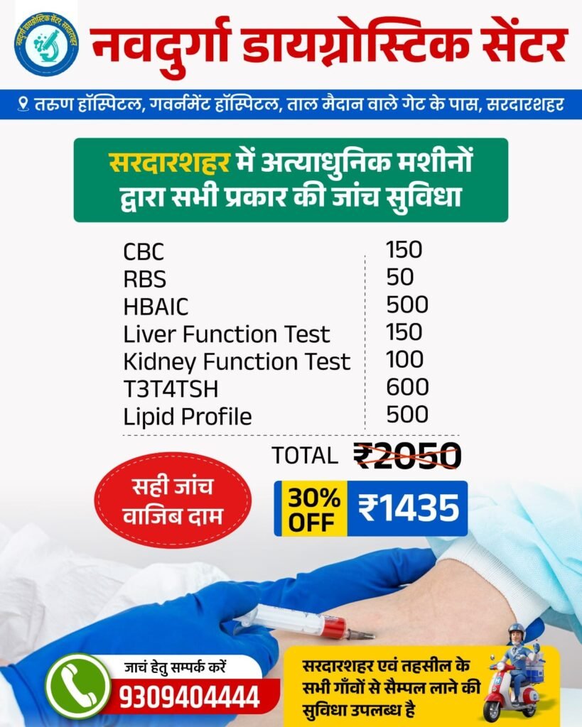 Navdurga Diagnostic Center is one of the most trusted and advanced pathology labs in Sardarshahar. We provide accurate, fast, and reliable diagnostic services using modern laboratory equipment and certified testing methods.